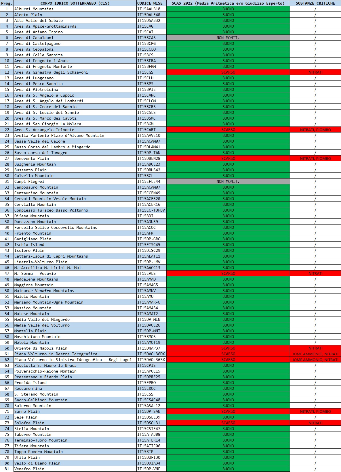 Con l’adozione del successivo PGA 2022-2027, i corpi idrici sotterranei sono stati ulteriormente aggiornati a 81, a seguito della suddivisione del corpo idrico “Basso Corso del Volturno e Regi Lagni” in due distinte unità: “Piana del Volturno in Destra Idrografica” e “Piana del Volturno in Sinistra Idrografica e Regi Lagni”.