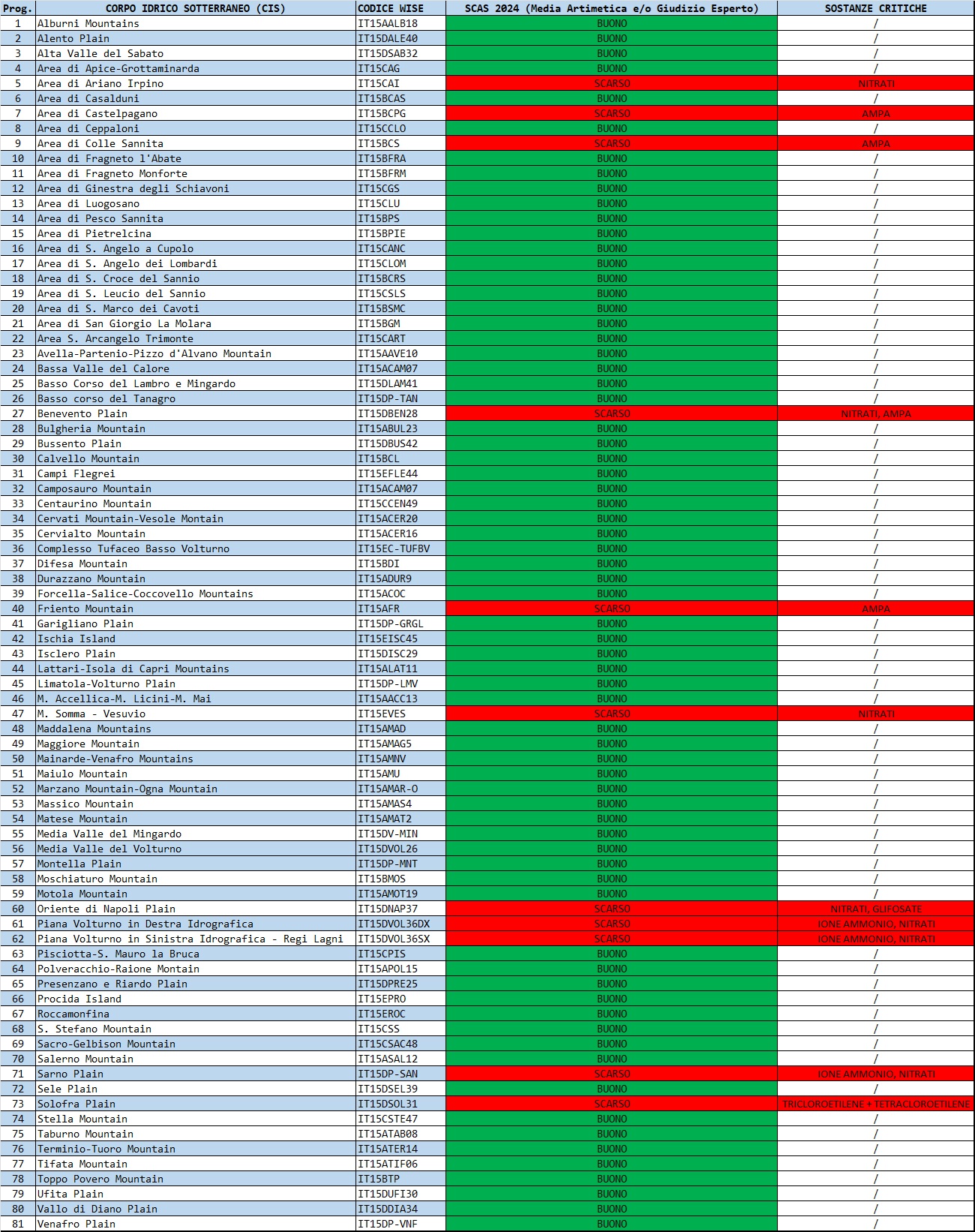 Di seguito sono riportale le mappe esplicative e le tabelle sintetiche degli esiti dello Stato Chimico annuale per ciascun corpo idrico sotterraneo della Campania relative all’attuale sessennio di riferimento per il monitoraggio 2021 - 2026